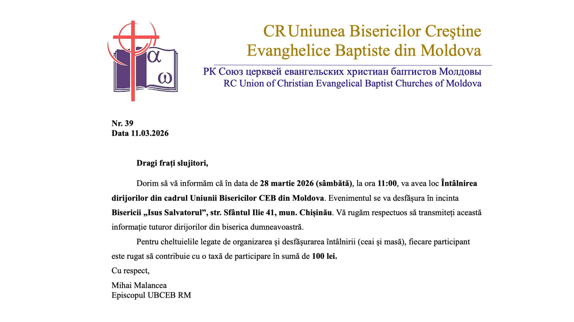 Dorim să vă informăm că în data de 28 martie 2026 (sâmbătă), la ora 11:00, va avea loc Întâlnirea dirijorilor din cadrul Uniunii Bisericilor CEB din Moldova. Evenimentul se va desfășura în incinta Bisericii „Isus Salvatorul”, str. Sfântul Ilie 41, mun. Chișinău. Vă rugăm respectuos să transmiteți această informație tuturor dirijorilor din biserica dumneavoastră.